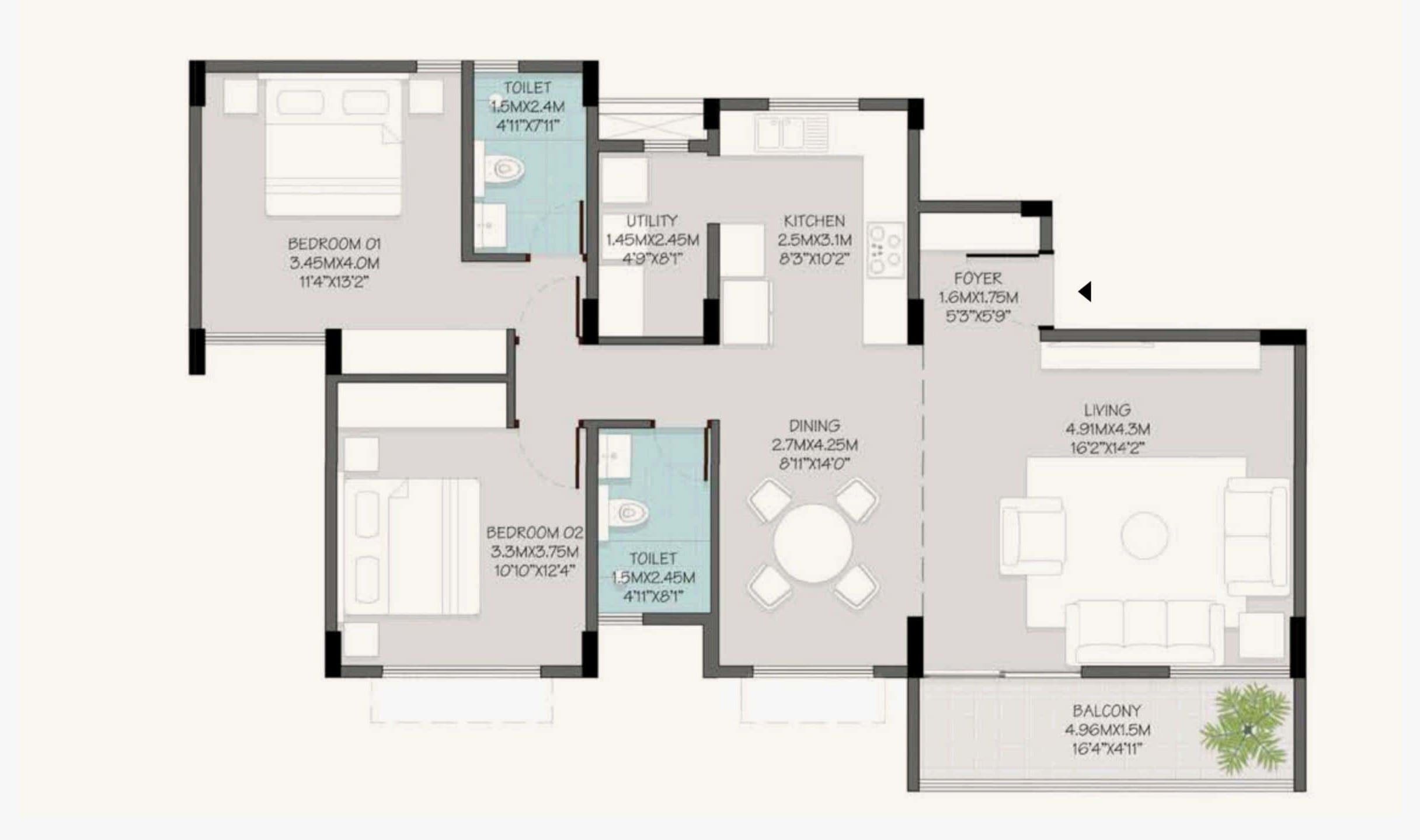 Modern Spaaces Green Storeys apartment sizes range from 1349 – 1851 sqft.
